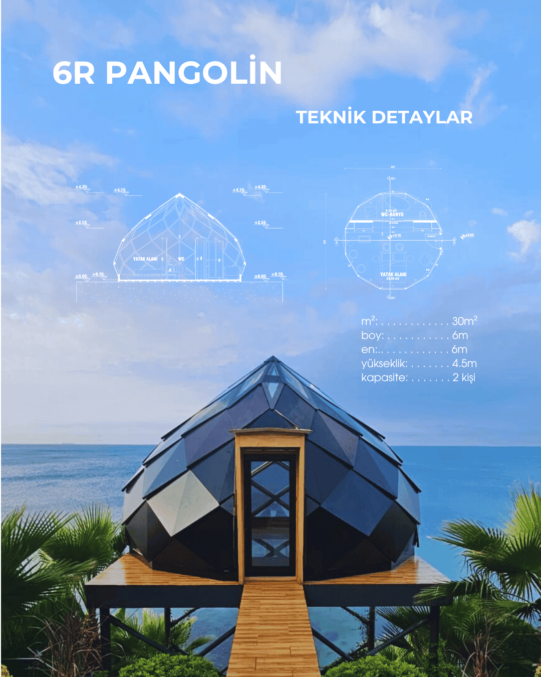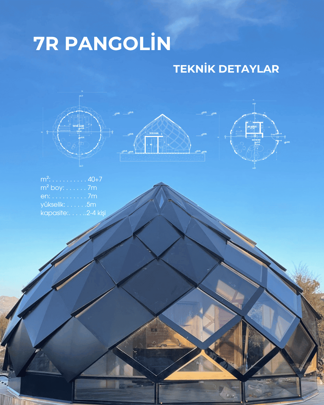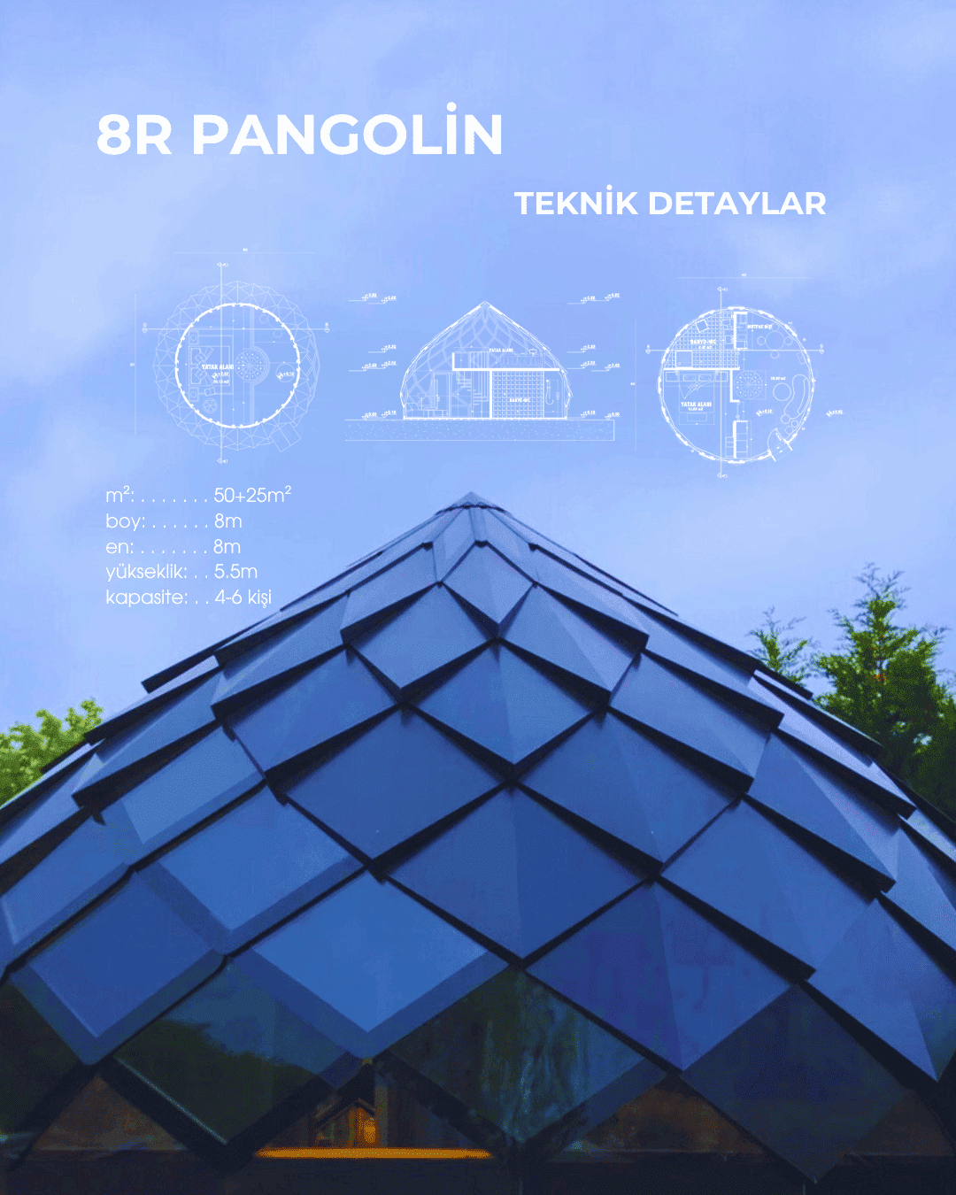Roomia House, dome ve pangolin evlerinde 6, 7 ve 8 metrelik çapların yanı sıra, dilediğiniz büyüklüğe kadar genişleme imkanı sunmaktadır. Böylece, farklı boyut seçenekleriyle yalnızca yaşam alanları değil, farklı işlevlere sahip alanlar da yaratılabilir.