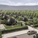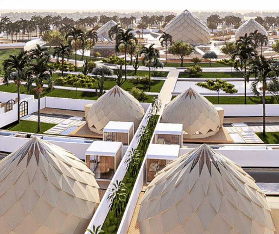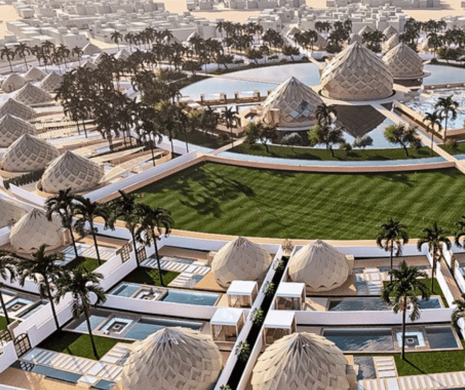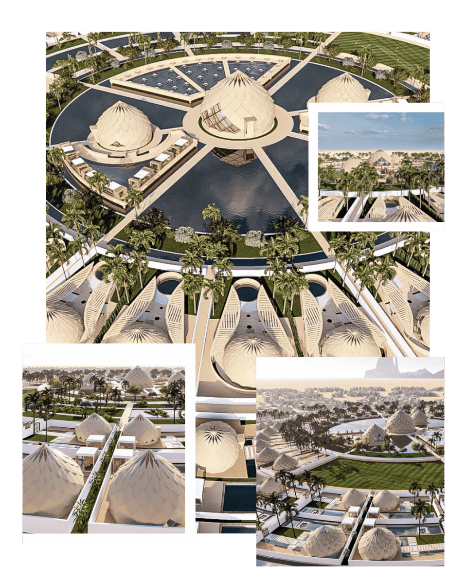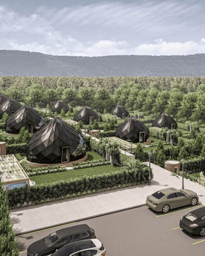 Katarlı müşterimiz için tasarlanan projede, 60 adet 8 metre çapında Pangolin, 20 adet 9 metre çapında VIP Pangolin, 2 adet 11 metre çapında SPA Pangolin ve 1 adet 15 metre çapında Pangolin olmak üzere toplamda 83 adet Pangolin evinden oluşan bir mega tesis tasarımı yaptık. Etrafında bolca havuz çözümleyerek, verandaları bu